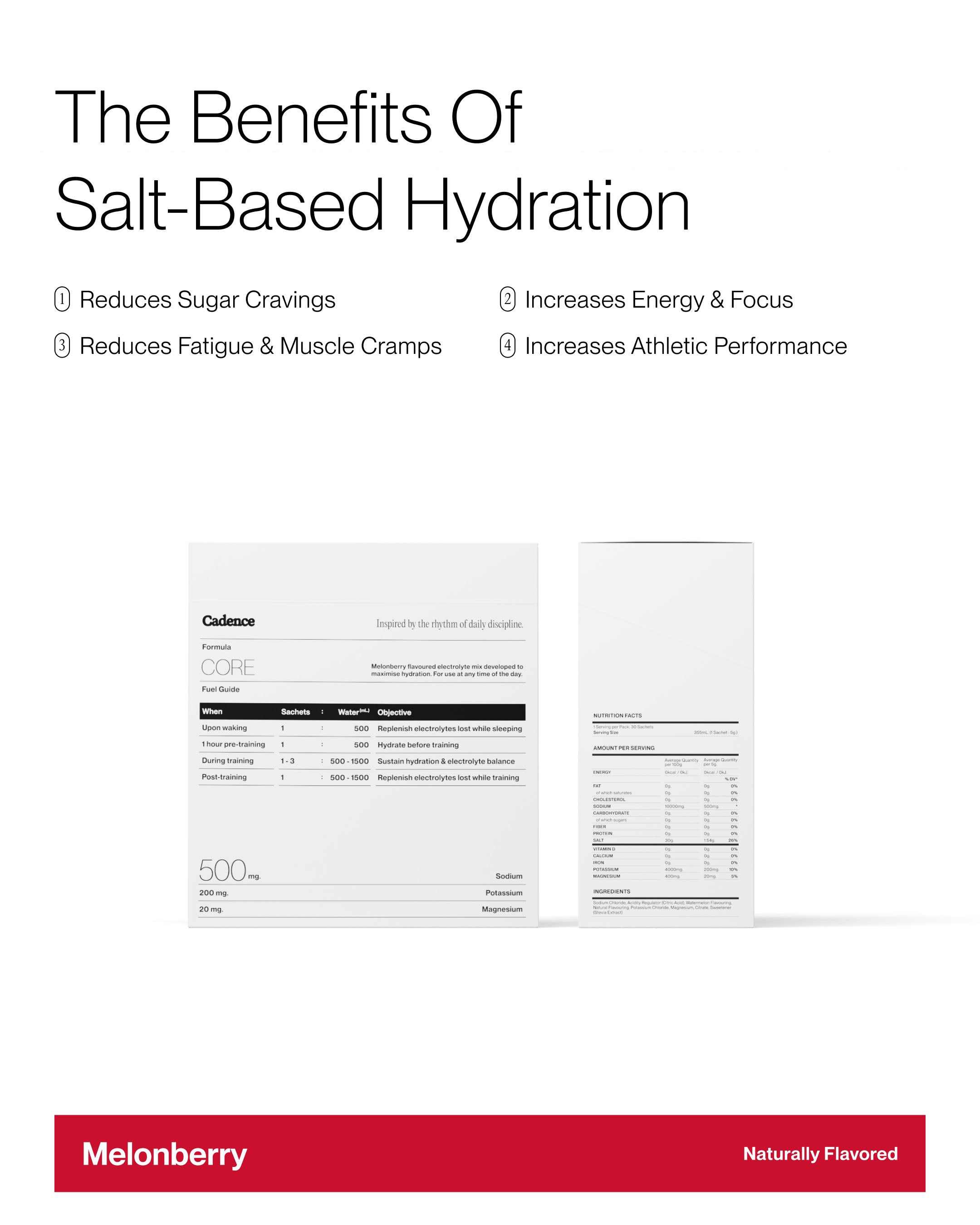 Core Hydration Sachets contain three key electrolytes in bioavailable forms: Sodium (as salt/sodium chloride), Potassium (as potassium chloride), and Magnesium (as marine magnesium citrate), scientifically formulated to optimise hydration, and improve mental and physical performance.