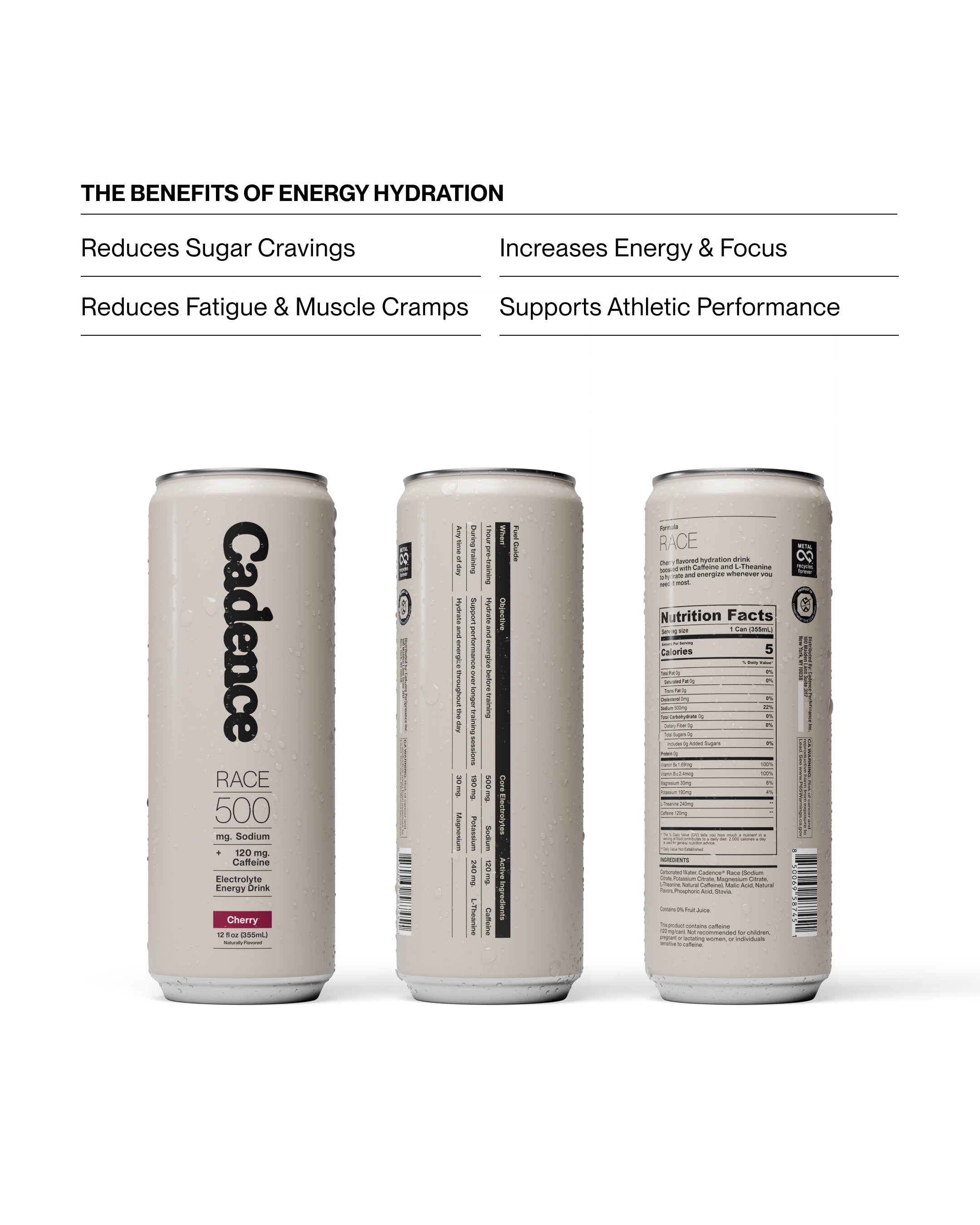 The Energy Hydration Drink contains three key electrolytes: Sodium, Potassium and Magnesium, formulated to support hydration and electrolyte balance in the body.
