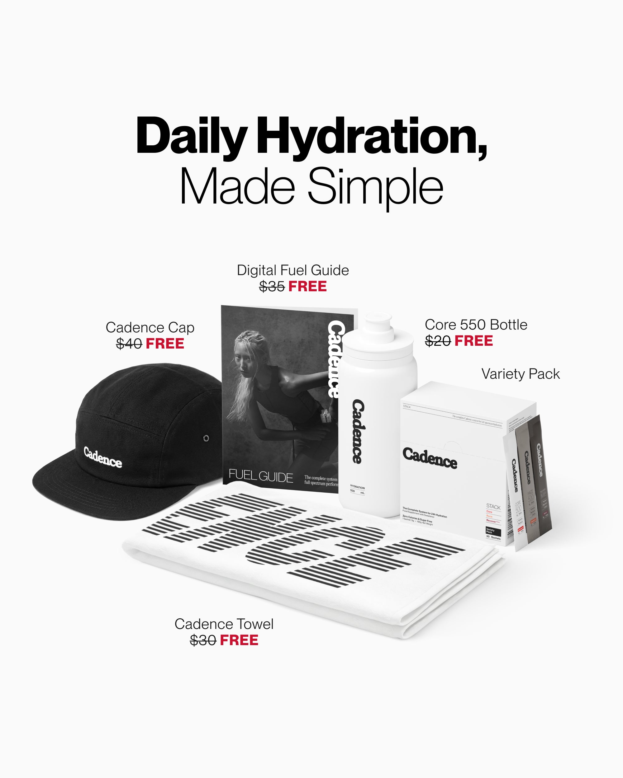 Cadence Hydration Sachets contain three key electrolytes in bioavailable forms: Sodium (as salt/sodium chloride), Potassium (as potassium chloride), and Magnesium (as marine magnesium citrate), scientifically formulated to optimise hydration, and improve mental and physical performance. With ratios dialled for specific use cases, they are the best electrolyte additives for water.